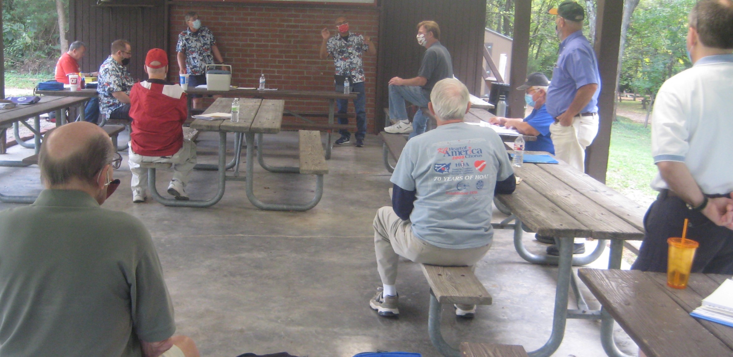 2020-09-19 We gathered at Cave Springs in Raytown, masked and maintaining social distance, to sing & socialize. Swing Shift performed a few songs, for the first time since the Covid shutdown.